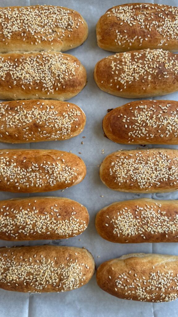 מוציאים את הבצק למשטח מקומח, מחלקים לכדורים של 70 גרם. מרדדים בעזרת הידיים כל כדור לצורת לחמניה ומניחים בתבנית. מתפיחים כשעה.