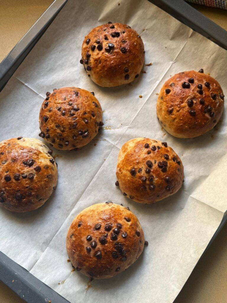 בקערה מערבבים את כל המרכיבים היבשים. מוסיפים ביצה, חמאה ווניל ומערבבים. בהדרגה מוסיפים חלב ומאחדים לבצק מעט דביק ואחיד. מתפיחים שעה. מדליקים תנור ל-180 מעלות. על משטח מקומח לשים מעט בצק ומפזרים לתוכו שוקוצ׳יפס ומקפלים היטב. מחלקים ל-6 כדורים, משטחים כל כדור ומניחים בפנים כף נוטלה, סוגרים היטב. מברישים בביצה ואופים כ-35 דקות. מברישים במי סוכר. בתאבון !