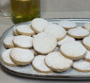 נצנן לאחר האפייה, נחתוך לפי החריצים ונפזר אבקת סוכר.