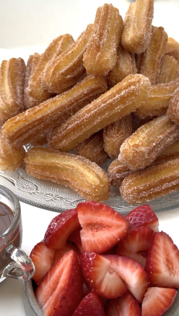 בקערה מערבבים סוכר וקינמון, מצפים את הצ׳ורוס ומגישים לצד מטבלי שוקולד .